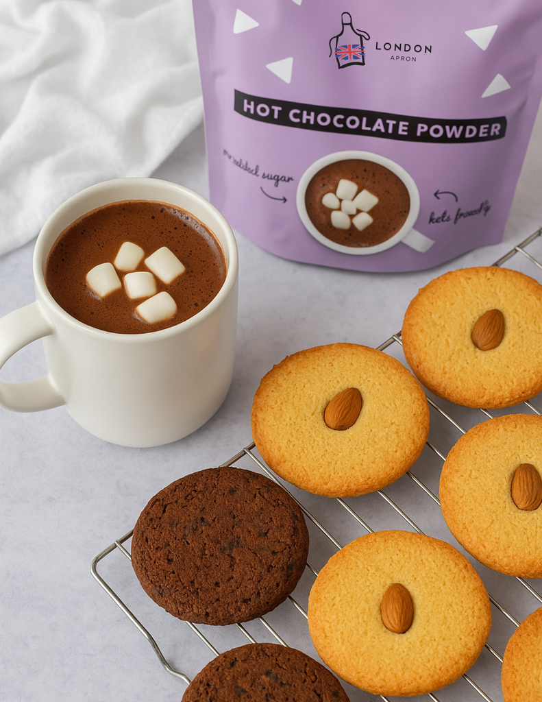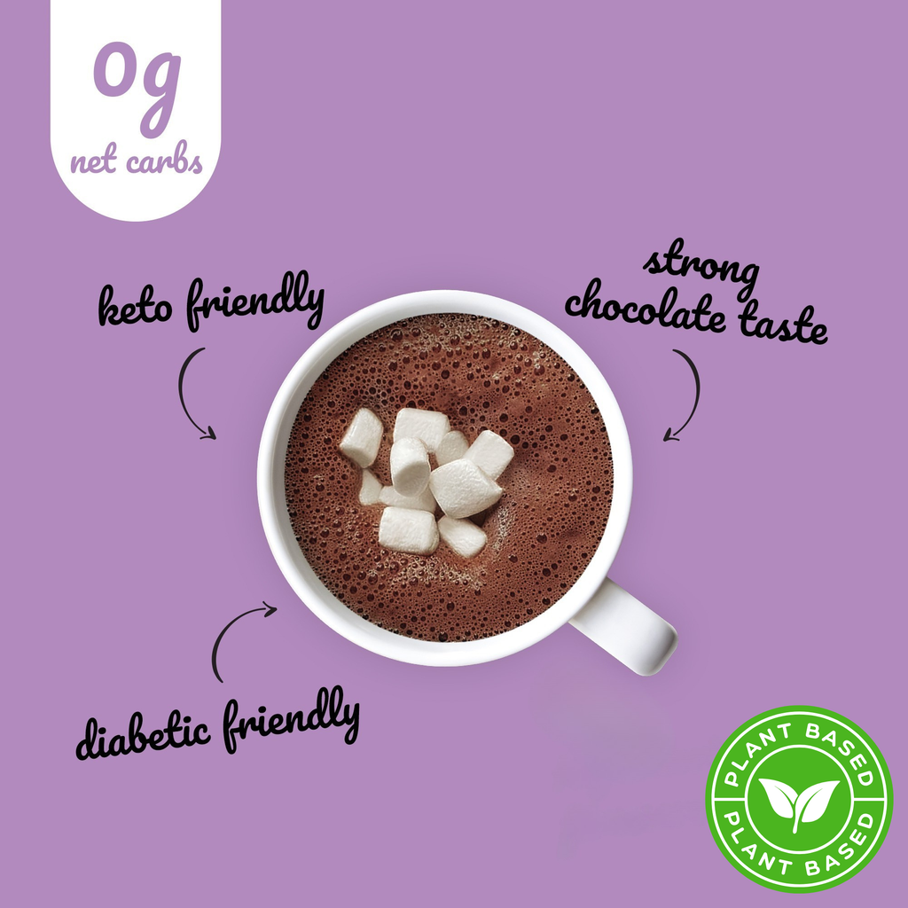 Indulge in our premium hot chocolate, crafted from the finest cocoa beans and sweetened naturally with erythritol , plus a hint of vanilla bean powder. Perfect with hot milk or a non-dairy alternative, this luxurious drink has no added sugars and suits keto, diabetic, and low-calorie diets.